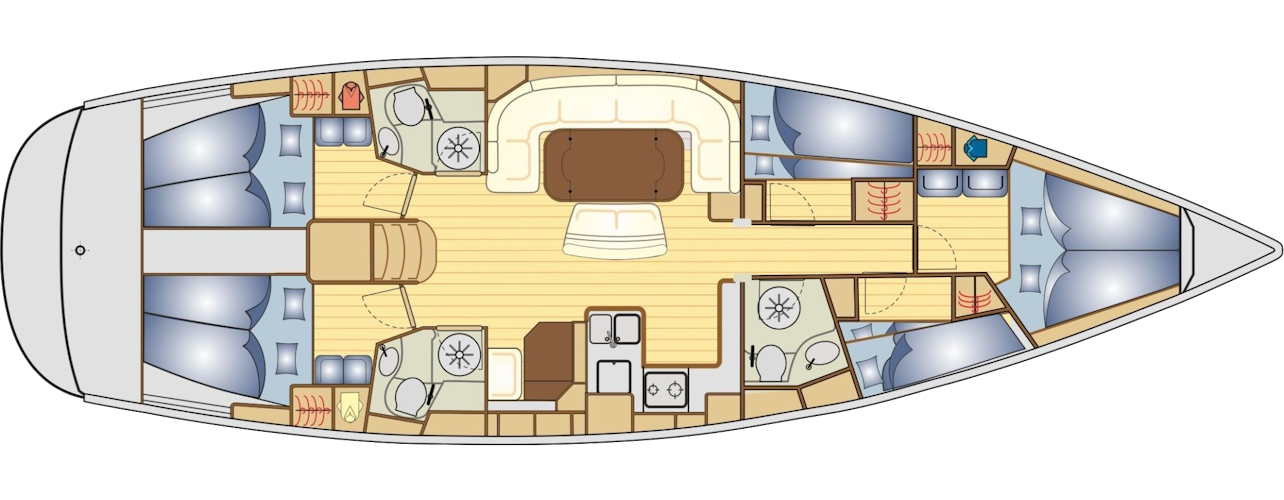 десять человек– обычно это шестеро взрослых, двое детей и два члена экипажа. Взрослые размещаются в двуспальных каютах, дети – в двухместных каютах с раздельными кроватями. Если вы путешествуете в одиночку или вдвоём с другом, вам также будет предоставлена такая каюта.