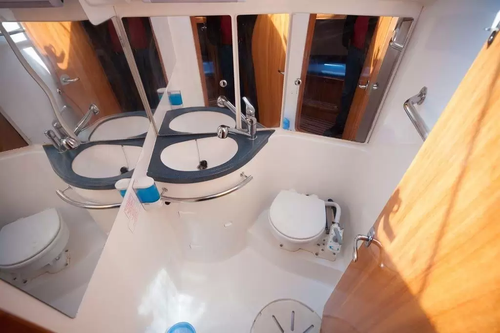 На борту нашей яхты три санузла: один в носовой части и два в корме. В каждом — туалет и душ, чтобы у всех был комфорт даже посреди моря. Однако, как и всё на судне, их использование имеет свои особенности.