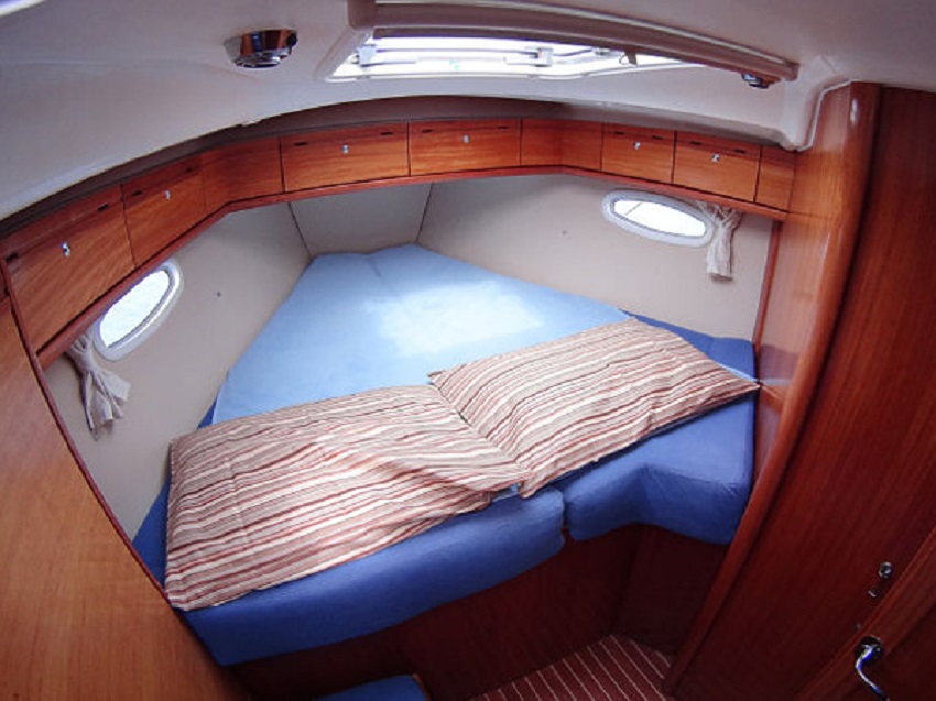 - в ней просторно и светло – идеальное место для двоих, а при необходимости и для маленького ребёнка. Большая кровать, вместительные рундуки для вещей и даже выход прямо на палубу через люк – романтика морских путешествий во всей красе!